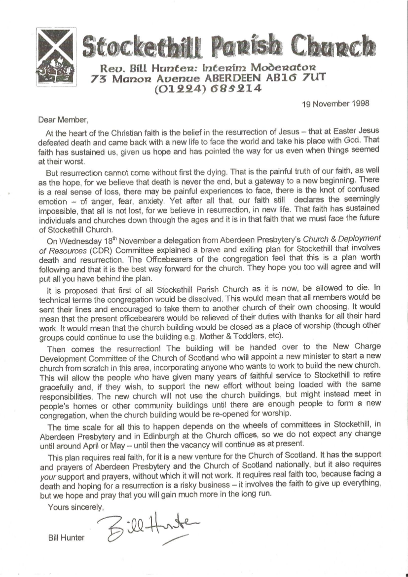 The beginnings of New Stockethill, New Charge Development were simpler than some other New Charges. Even so, the relationship of the new congregation to the old still had to be discussed and managed and have created constructed tensions that continue to stimulate debate and thought today.
